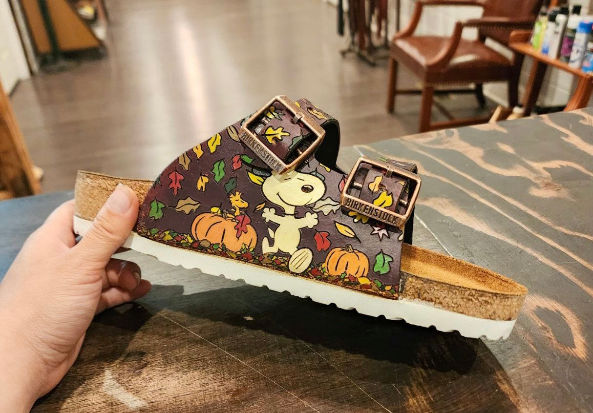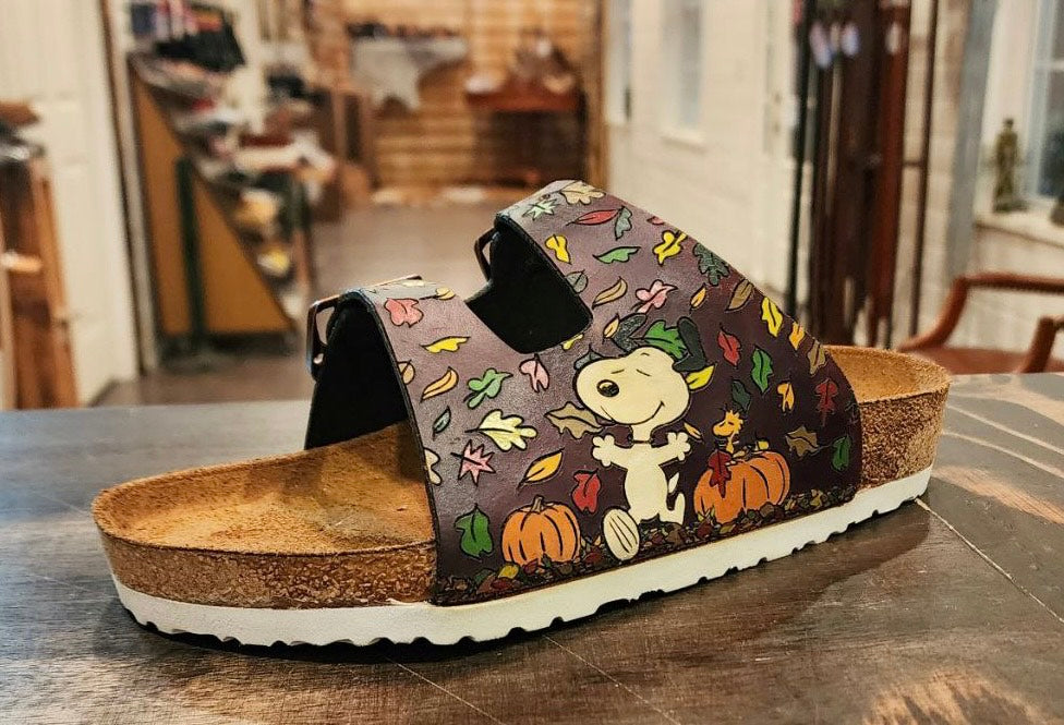 One of the many cute designs we offer, these Snoopy Pumpkinstocks are sure to set you apart from the crowd! Each pair is handmade right in our shop. They feature Snoopy walking through falling leaves with Woodchuck relaxing on a pumpkin. Each strap is made from a vedge tan leather, engraved, and hand-painted to bring the design to life. We use authentic Birkenstock footbeds, soles, and buckles to ensure the best quality. Simply choose which footbeds you want, what color sole and buckle, then leave the rest to us. Once we get your order, we will contact you to confirm the details and get started on your Birk-inspired sandals! Please note each pair is made to order so allow for at least 1-2 weeks from your order date for your Birks to be completed and shipped out!