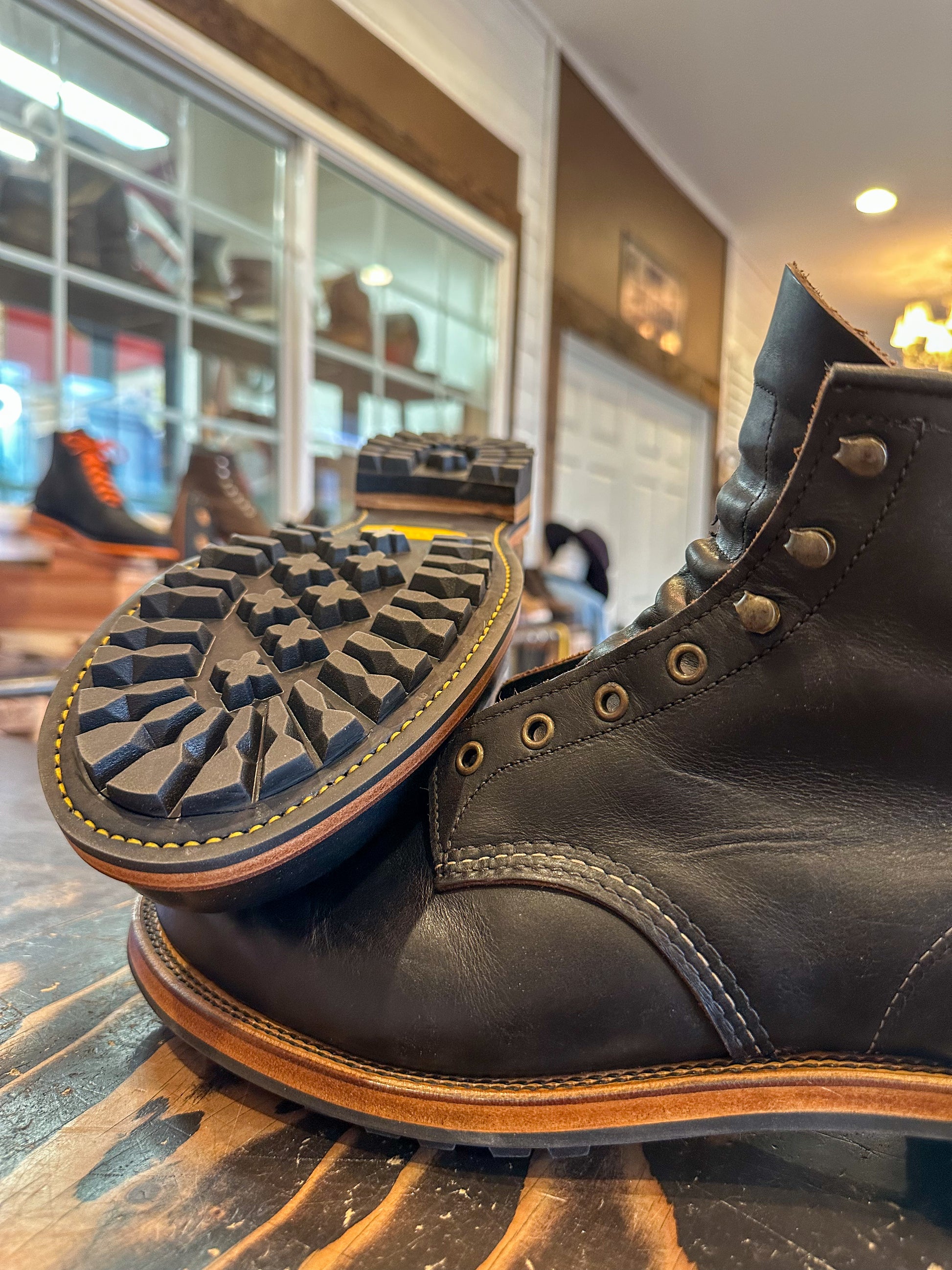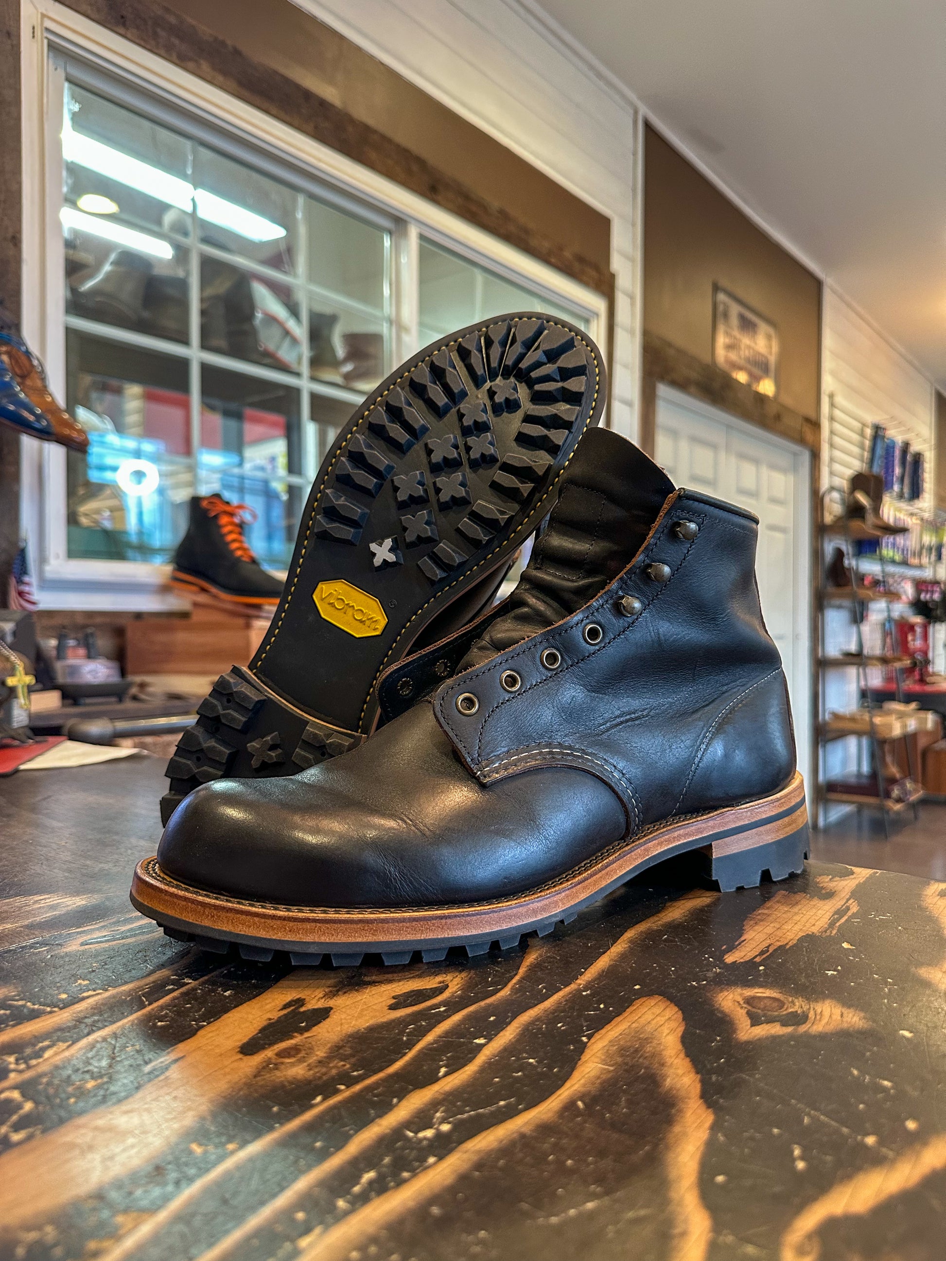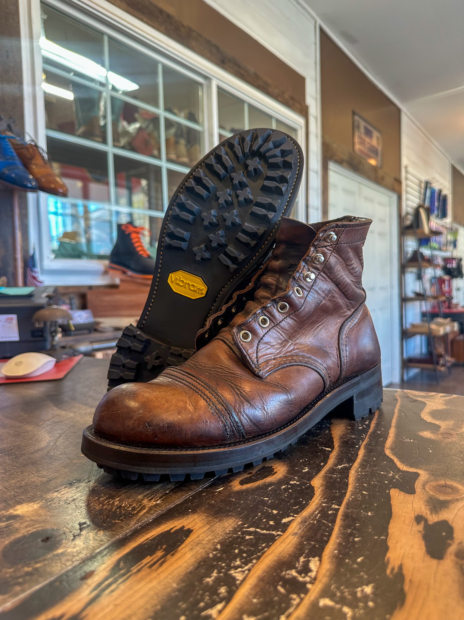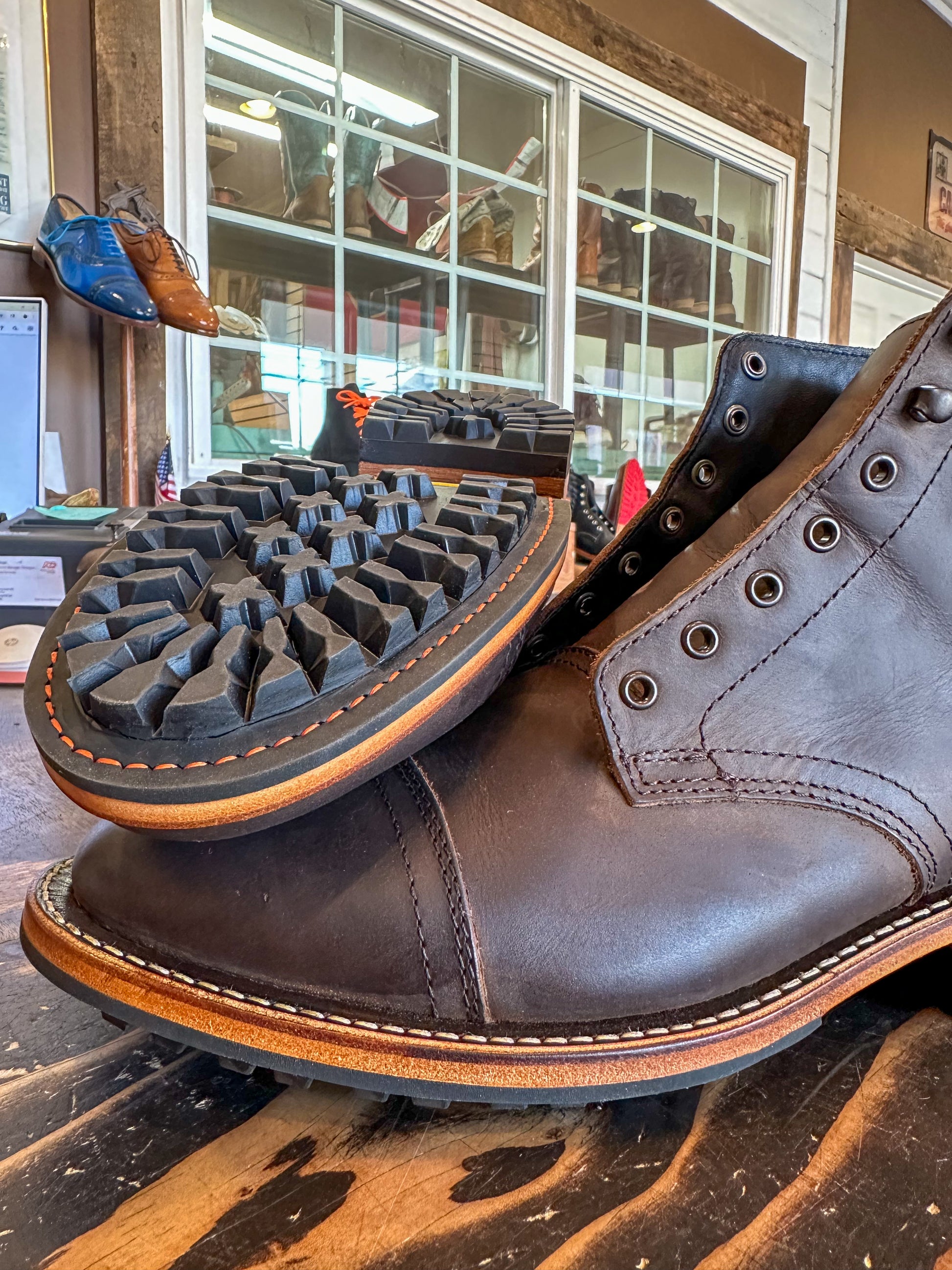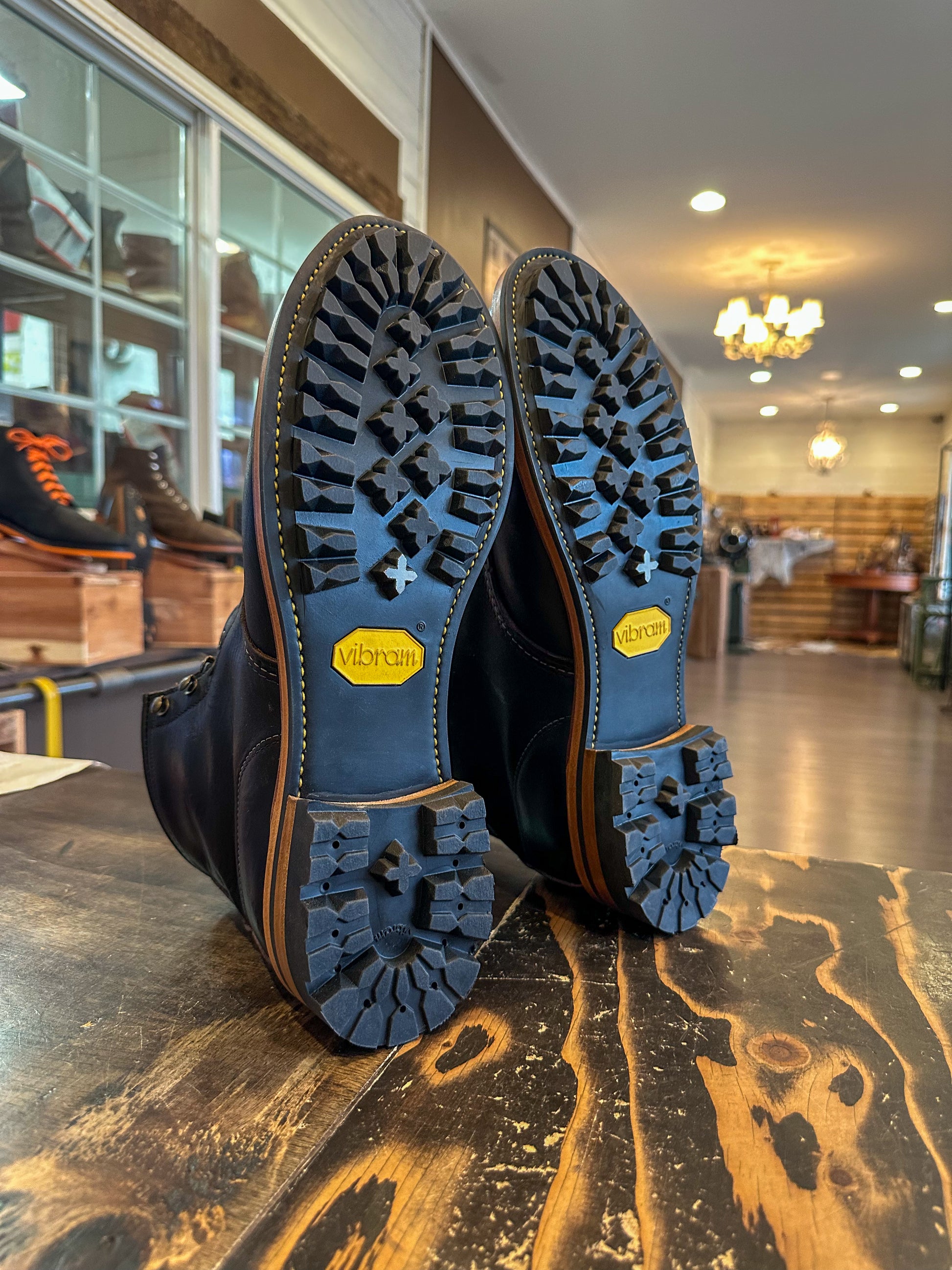 The Commander Recraft is a Custom Commando Half Sole Recraft. We took the Vibram 100 Lug Sole, cut it in half, and trimmed the edges to create this beautiful Logger Hybrid Sole. If you like the grip and durability of a lug sole, but don't like such a bulky edge, this Recraft is perfect for you.