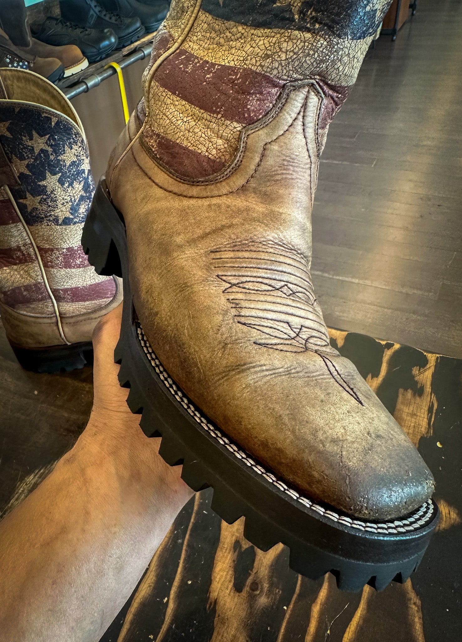 Revamp your cowboy boots with our premium Cowboy Lug Package! Designed with the rugged and reliable Vibram 100 Lug sole and heel, this package is perfect for those who love riding motorcycles and need that extra grip and durability.